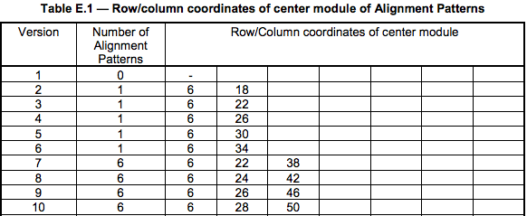 关于Alignment的位置,可以查看QR Code Spec的第81页的Table-E.1的定义表(下表是不完全表格)