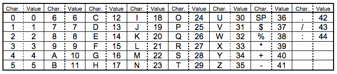 Alphanumeric mode 字符编码。包括 0-9,大写的A到Z(没有小写),以及符号$ % * + – . / : 包括空格。这些字符会映射成一个字符索引表。如下所示:(其中的SP是空格,Char是字符,Value是其索引值) 编码的过程是把字符两两分组,然后转成下表的45进制,然后转成11bits的二进制,如果最后有一个落单的,那就转成6bits的二进制。而编码模式和字符的个数需要根据不同的Version尺寸编成9, 11或13个二进制(如下表中Table 3)