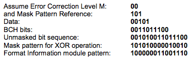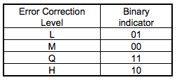• 5个数据bits:其中,2个bits用于表示使用什么样的Error Correction Level, 3个bits表示使用什么样的Mask