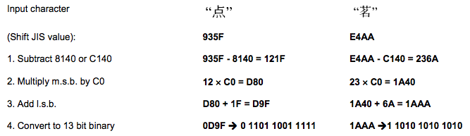 Kanji mode 这是日文编码,也是双字节编码。同样,也可以用于中文编码。日文和汉字的编码会减去一个值。如:在0X8140 to 0X9FFC中的字符会减去8140,在0XE040到0XEBBF中的字符要减去0XC140,然后把结果前两个16进制位拿出来乘以0XC0,然后再加上后两个16进制位,最后转成13bit的编码。如下图示例: