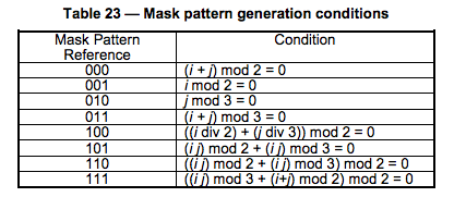 这样下来,我们的图就填好了,但是,也许那些点并不均衡,如果出现大面积的空白或黑块,会告诉我们扫描识别的困难。所以,我们还要做Masking操作(靠,还嫌不复杂)QR的Spec中说了,QR有8个Mask你可以使用,如下所示:其中,各个mask的公式在各个图下面。所谓mask,说白了,就是和上面生成的图做XOR操作。Mask只会和数据区进行XOR,不会影响功能区。(注:选择一个合适的Mask也是有算法的