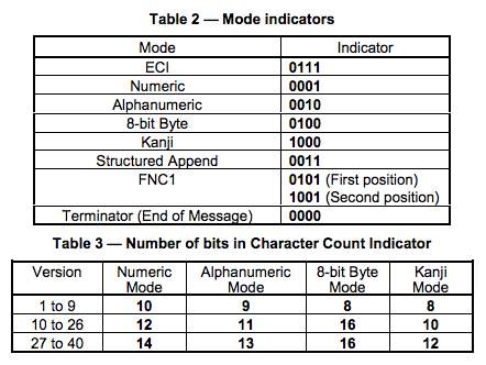 Numeric mode 数字编码,从0到9。如果需要编码的数字的个数不是3的倍数,那么,最后剩下的1或2位数会被转成4或7bits,则其它的每3位数字会被编成 10,12,14bits,编成多长还要看二维码的尺寸(下面有一个表Table 3说明了这点)