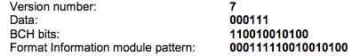 Version Information一共是18个bits,其中包括6个bits的版本号以及12个bits的纠错码,下面是一个示例: