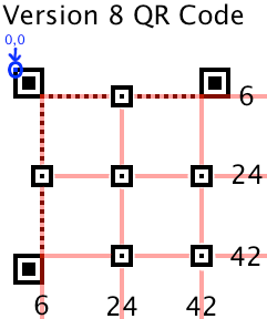 • Timing Patterns也是用于定位的。原因是二维码有40种尺寸,尺寸过大了后需要有根标准线,不然扫描的时候可能会扫歪了。