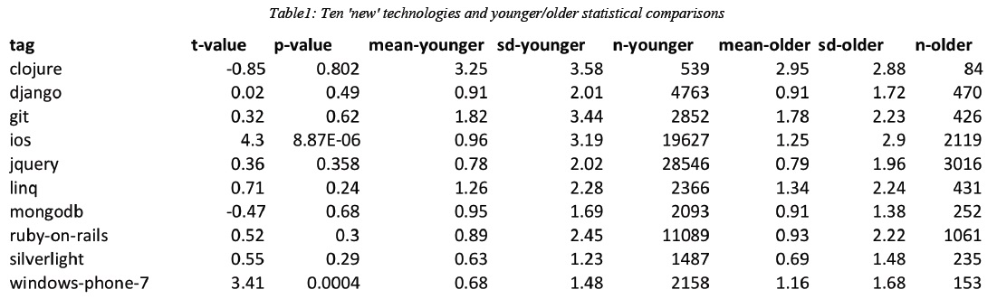 论文的作者分析了Tag,用了最近5年内比较流行的技术Tag,然后用了一套比较严谨的算法来查看那些所谓的“老程序员”是否在新技术上跟上不了,所谓跟不上,也就是这些老的程序员在回答这些新技术上并不活跃。所谓老,就是37岁以上的程序员(就是我现在的年纪)。