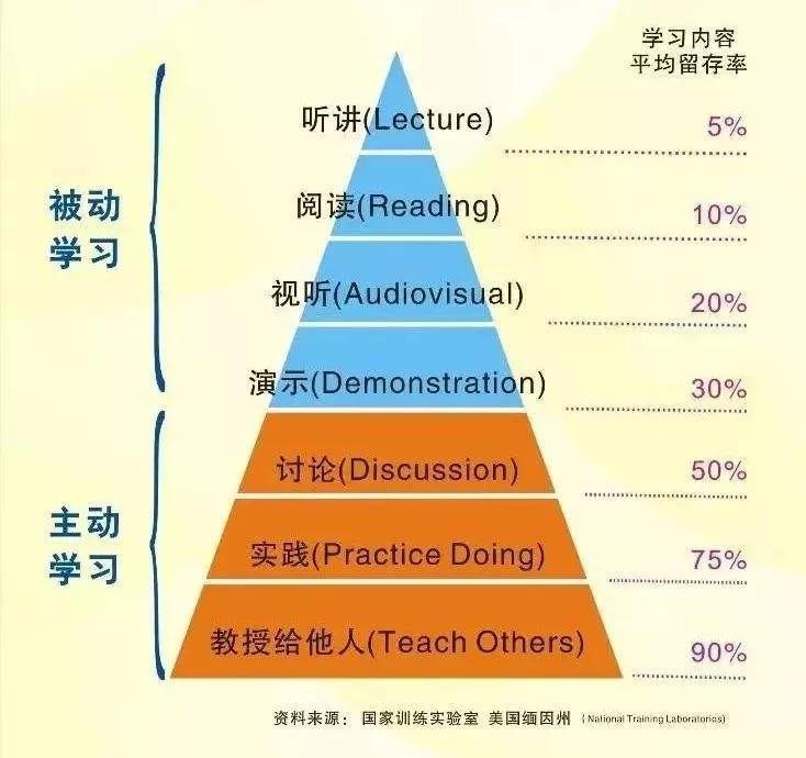 谈到学习效率,就需要拿出这张学习金字塔的图来了。从图可以看到学习方法分布两层,一种是被动学习,也是浅度学习,听讲,阅读,视听,演示都是在被动学习,而与人讨论,自己动手实践,教授给别人是主动学习。主动学习我们称之为深度学习,如果你不能深度学习,你就不能真正学到东西。这也是你会经常有“学那么多干什么,不用就忘了”,这就是浅度学习的症状了。
