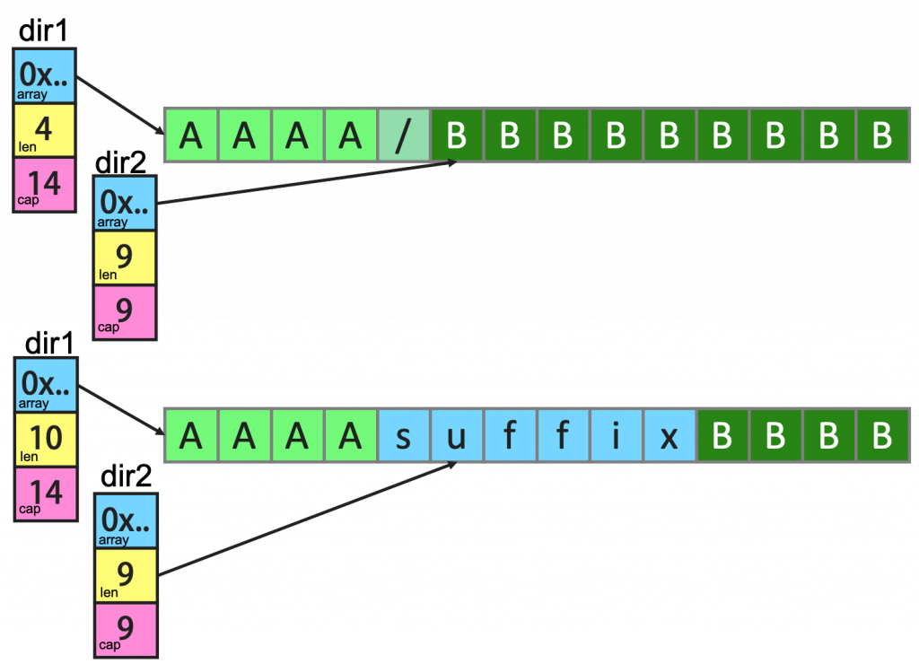 上面这个例子中,dir1 和 dir2 共享内存,虽然 dir1 有一个 append() 操作,但是因为 cap 足够,于是数据扩展到了dir2 的空间。下面是相关的图示(注意上图中 dir1 和 dir2 结构体中的 cap 和 len 的变化)