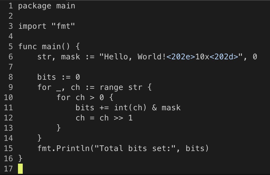 我们先来看一个示例,下面这段 Go 的代码就会把 “Hello, World”的每个字符转成整型,然后计算其中多少个为 1 的 bit。
