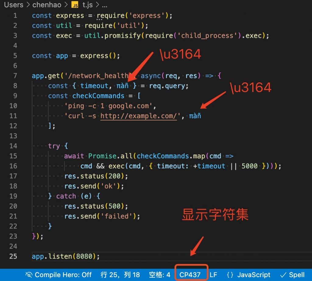 然后,上面这个代码是有不可见的Unicode 字符,如果你使用VSCode,把编码从 Unicode 改成 DOS (CP437) 后你就可以看到这个Unicode了