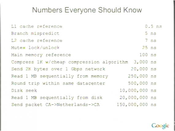 - 代码的性能将会是想当的重要。Jeff给了一张叫“Numbers Everyone Should Know” 的slide,如下所示,我觉得太经典了,其中的东西,如果你看过我的那篇“给老婆普及计算机知识”,我想我不需要多解释了。(注:1 ns = 十亿分之一秒)