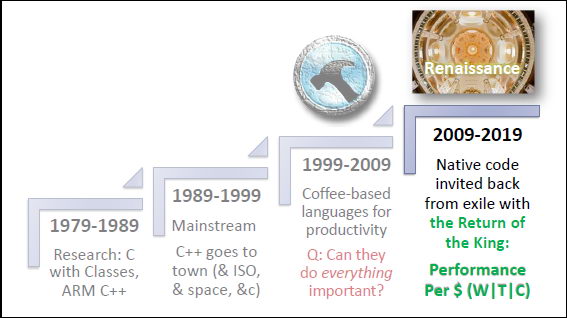 Herb认为,2009-2019是第四个时期,因为我们又喜欢Native Code了,C++从被驱逐后又被请回来了。因为网站的性能越来越是个问题,移动端的设备非常流行。但主要是因为Performance就是钱,因为前面的三个因素,性能影响的是dollar,不尊重性能的公司都会发现花钱的速度太快了。(比如去年大家热炒的京东促销和12306.cn的问题,12306给整个社会造成了巨大的金钱浪费)