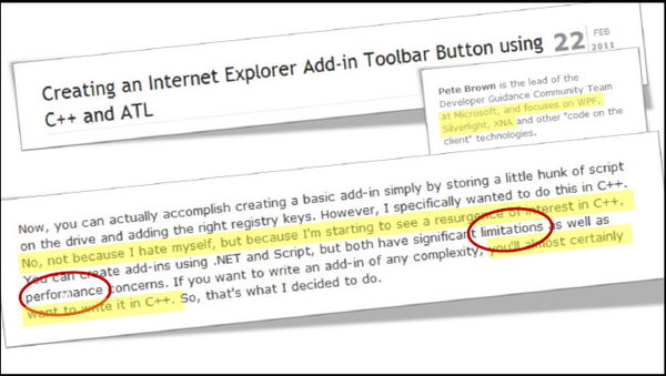 6)Herb举了一个微软内的例子,用C++ 和 ATL 来开发IE工具条的报告,意思是你可以用脚本在IE的工具条上加按钮,但是作者建议使用C++,因为用.NET或是脚本有重大的limitation,尤其是性能上的问题。
