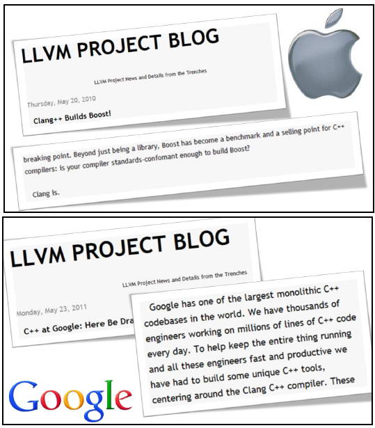 8)如果你还是不相信的话,我们可以看看为什么Apple和Google都在搞C++的编译器,因为他们觉得g++性能不行。所以,基于LLVM的编译器正在领导潮流,因为我们关注Natvie Code的性能优化。
