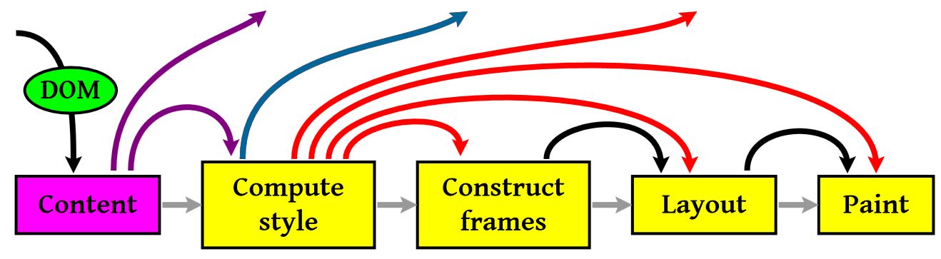 注意:上图流程中有很多连接线,这表示了Javascript动态修改了DOM属性或是CSS属会导致重新Layout,有些改变不会,就是那些指到天上的箭头,比如,修改后的CSS rule没有被匹配到,等。
